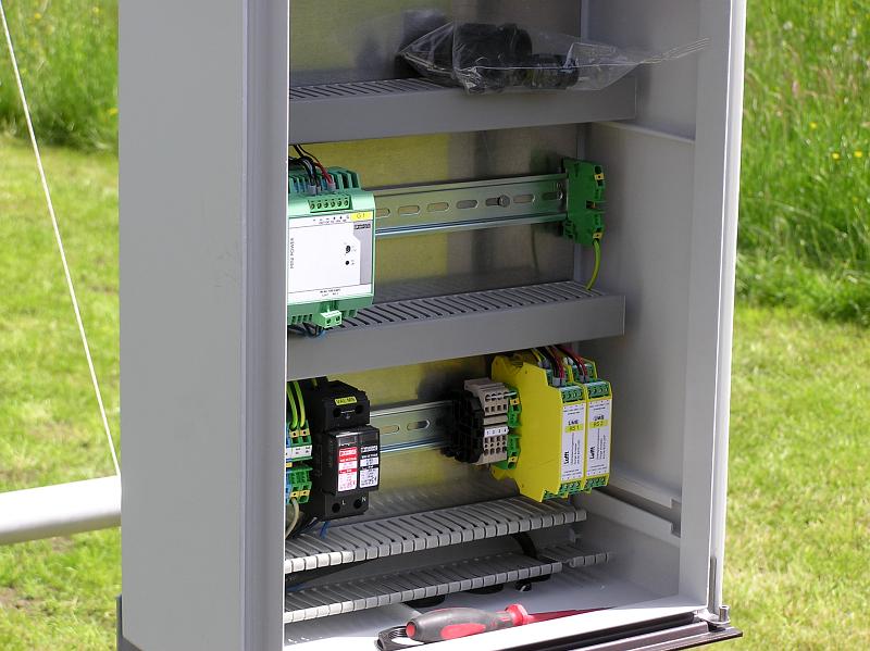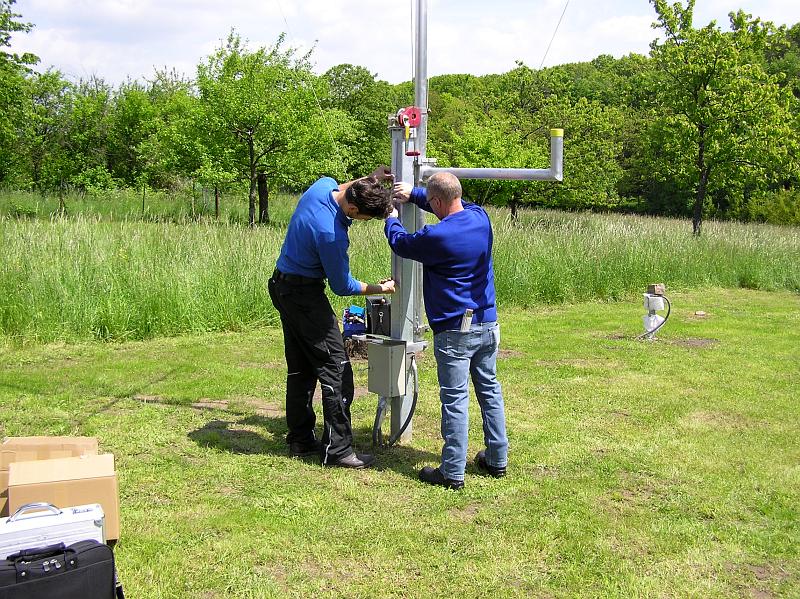 Anwesend an diesem Tag war der Techniker Dusko Voskar von der Firma LUFFT, der die Sensoren montierte und im Lufft Schaltkasten mit dem Metrilog Datenlogger zusammenführte. Somit konnten die Messwerte per Mobilfunk an meteomedia übermittelt werden.